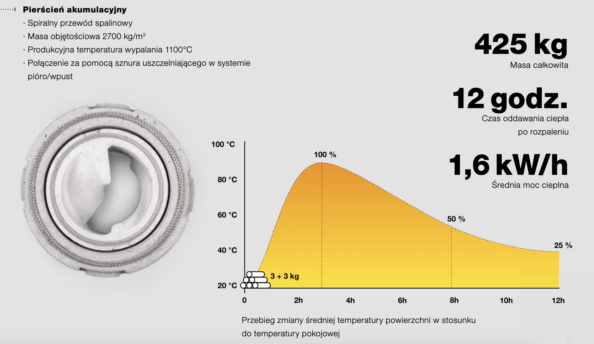 Piec Hoxter BLOX jest wyposażony w dodatkową masę akumulacyjną, tzw. krążki akumulacyjne, która zwiększa zdolność pieca kaflowego do magazynowania i oddawania ciepła, dzięki czemu moc wkładu zwiększa się do 24 kW. Jeden krążek akumulacyjny waży około 30 kg. Zestaw zawiera 5 krążków.