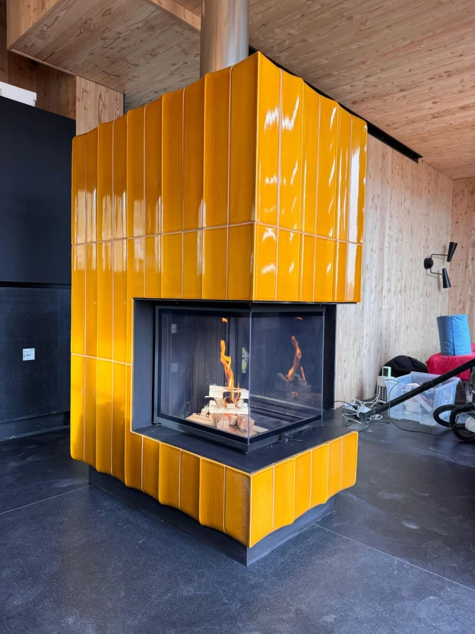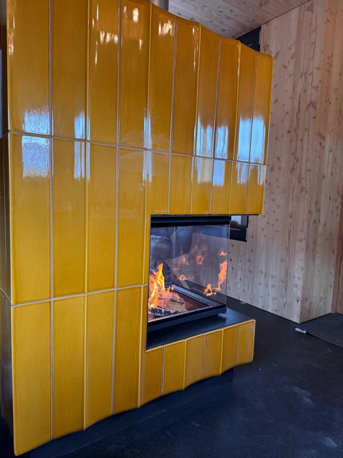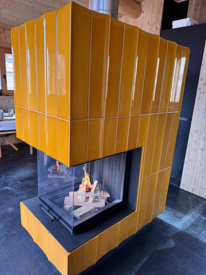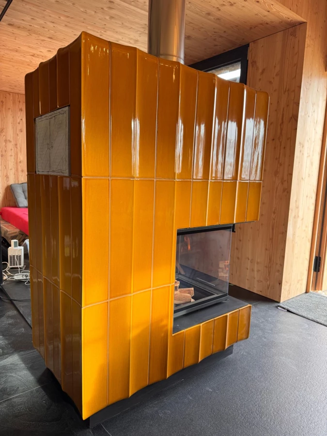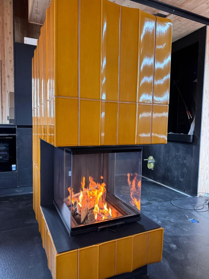Trójstronny kominek kaflowy w kolorze miodu lipowego